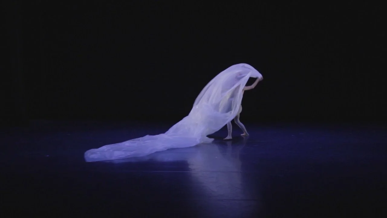 As though encapsulated in a cocoon, Melanie rises and emerges to manipulate her shelter like a soaring wave. Spiraling, trailing, wrapping and spreading, the former cocoon evokes a variety of images such as wings, a veil, a dress and a cloud. An expression of exit and re-entry, Delve seeks to image the innateness of wanting to return.